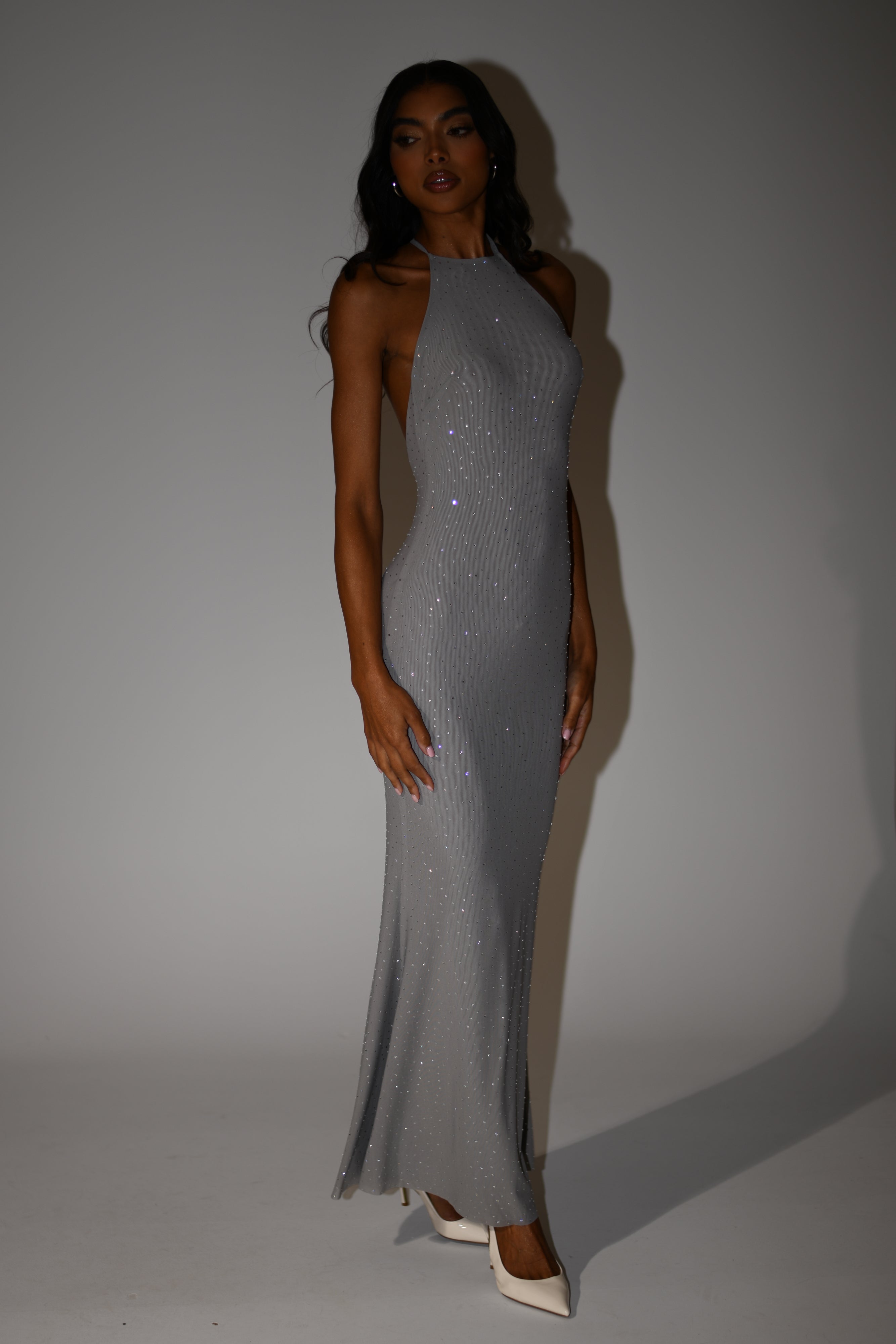 Kali Hot Fix Mesh Halter Maxi Dress - Gunmetal