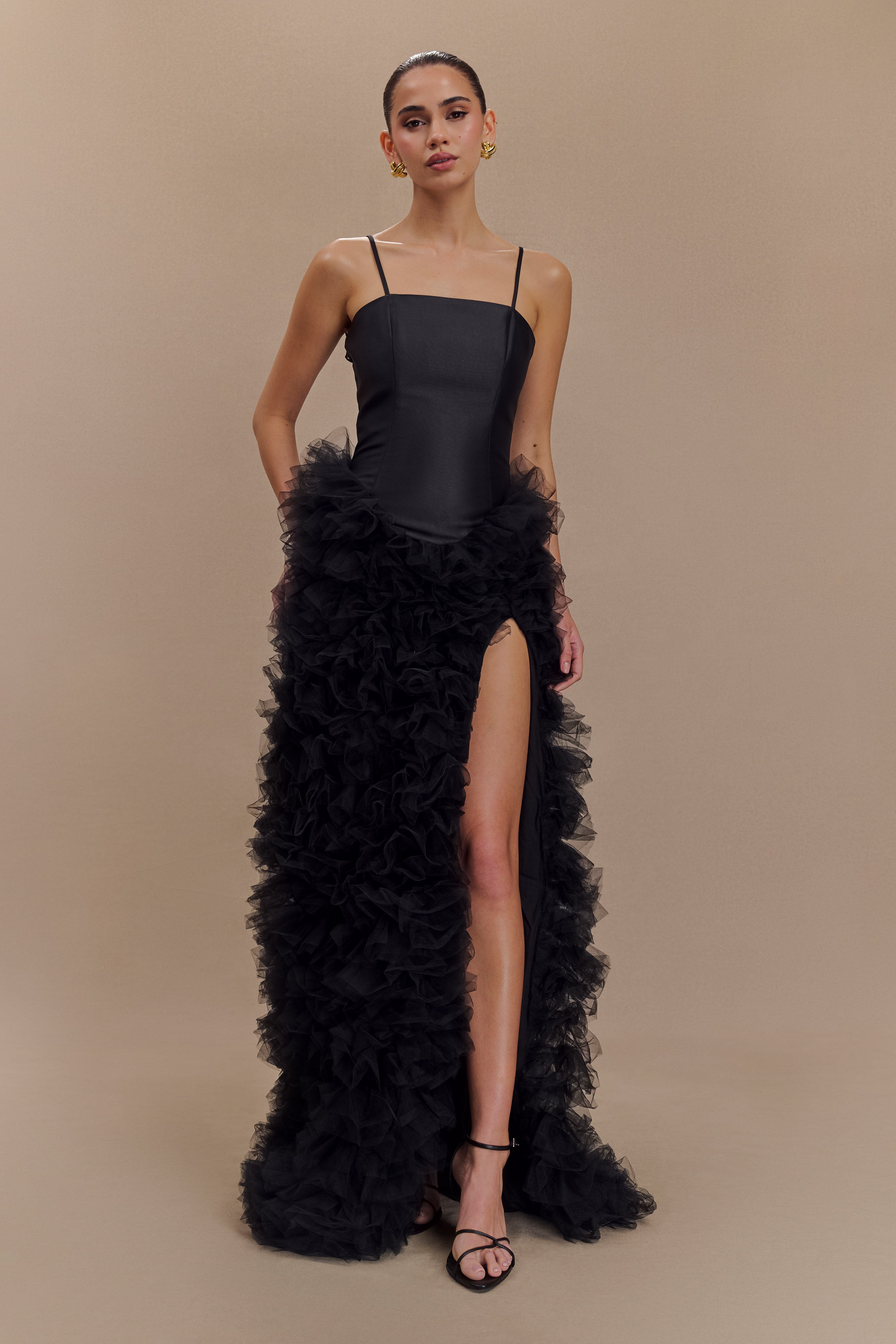 The MAGNOLIA Tiered Ruffle Maxi Dress is a captivating blend of elegance and charm. Featuring a straight neckline and adjustable straps, this dress ensures a perfect fit. The fitted bodice and round waistline accentuate your figure, while the full chiffon ruffle skirt adds a touch of whimsy. With its maxi length and front leg split, the Magnolia dress is perfect for making a graceful statement at any special occasion.
