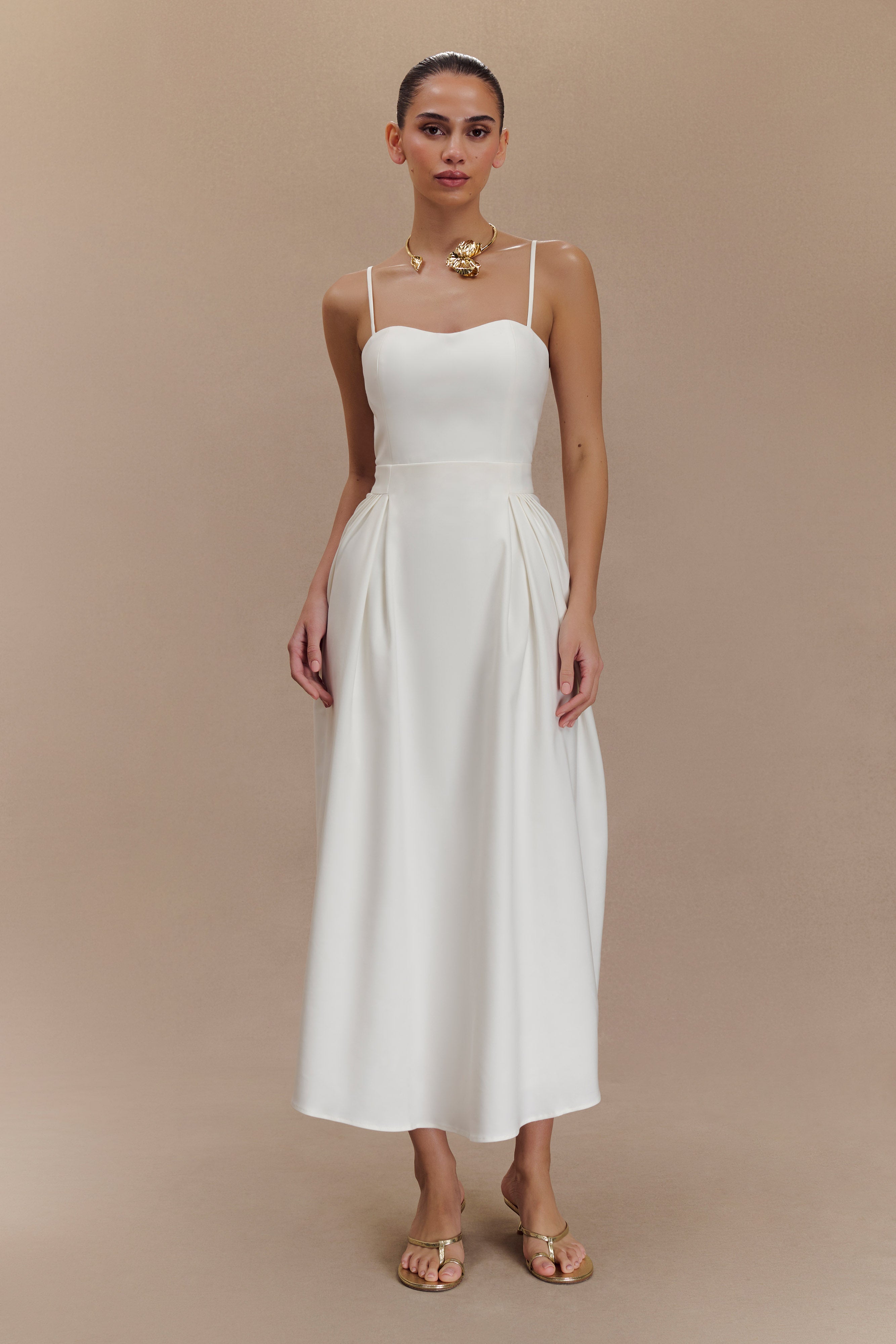 Step into effortless elegance with the REBECCA Cotton Midi Dress. This stunning piece features a flattering princess neckline and adjustable back straps with a charming tie detail, ensuring a perfect fit. The fitted waist accentuates your silhouette, while pleat detailing at the hips adds a touch of sophistication. The full skirt offers graceful movement, and the midi length makes it versatile for any occasion. With a convenient centre back zip and a fully lined design, the Rebecca dress combines comfort and style seamlessly.