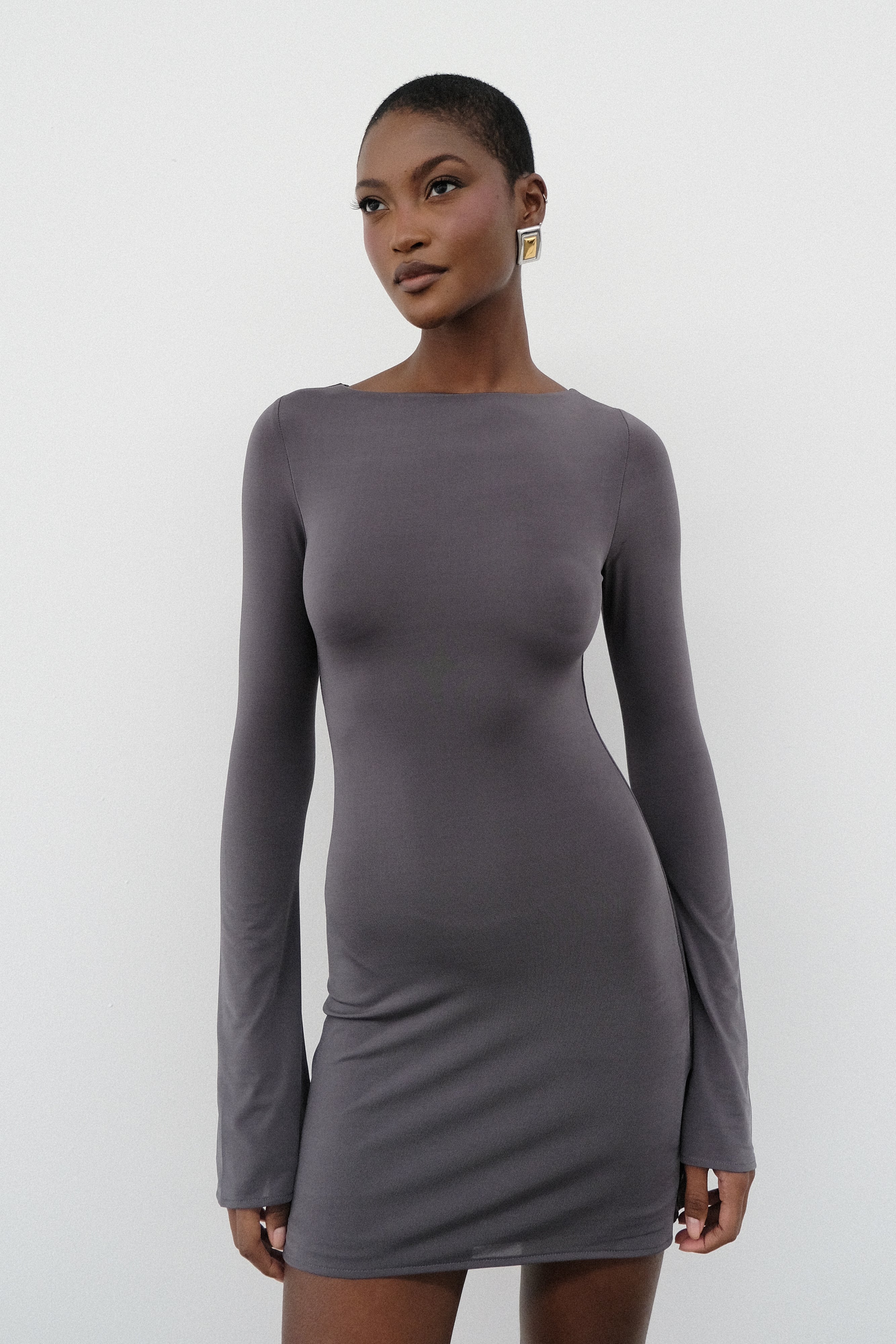 Beautifully body-hugging, TARNA is a slinky mini dress with a boat neckline, flared sleeves, and a classic fishtail hem. Its stretchy material enhances your silhouette in all the best ways. The flared shape of both the sleeves and the hem adds an air of confidence, making this the perfect fit for evening events.